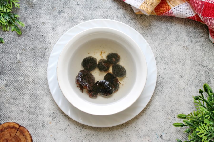 Чернослив вымойте и залейте горячей водой. Оставьте на 10 минут, чтобы стал мягким. Откиньте на сито и дайте воде полностью стечь.