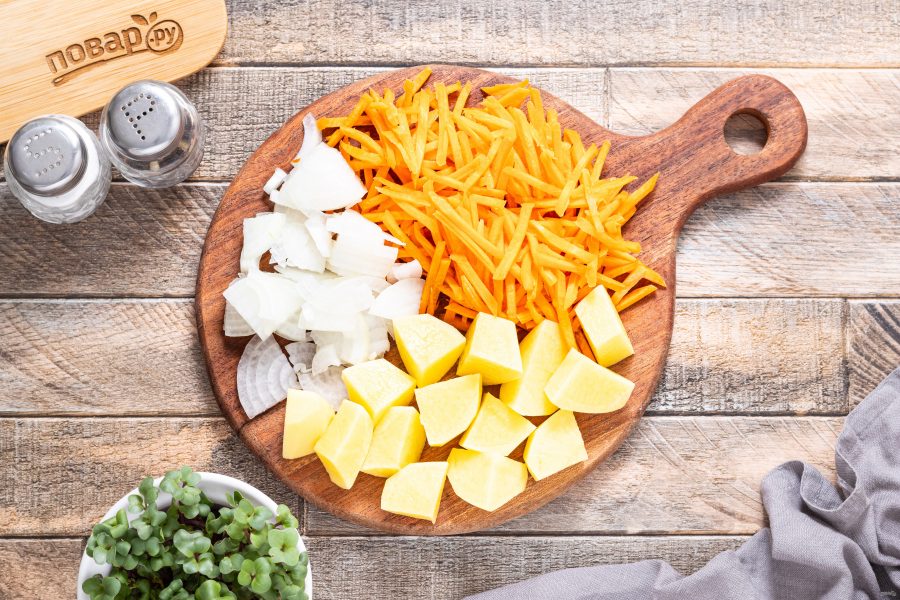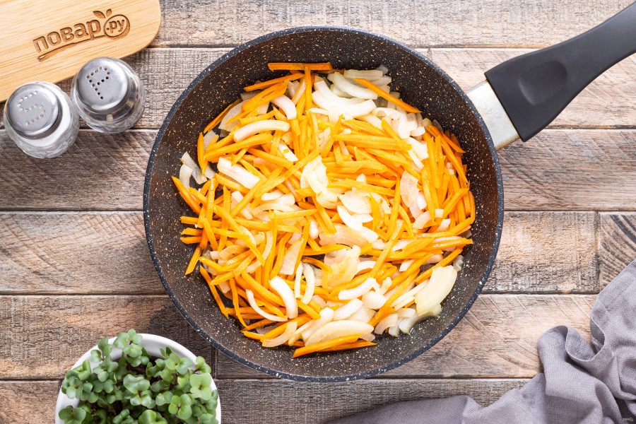 Разогрейте сковороду на среднем огне. Обжарьте репчатый лук с морковью до мягкости и золотистого цвета.