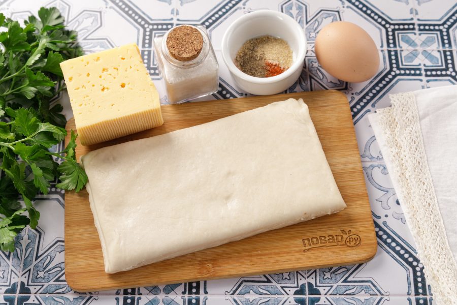 Подготовьте все ингредиенты по списку. Тесто достаньте заранее, чтобы оно разморозилось. Сыр подойдёт любой, который хорошо плавится. Специи берите на свой вкус, соль — по желанию.
