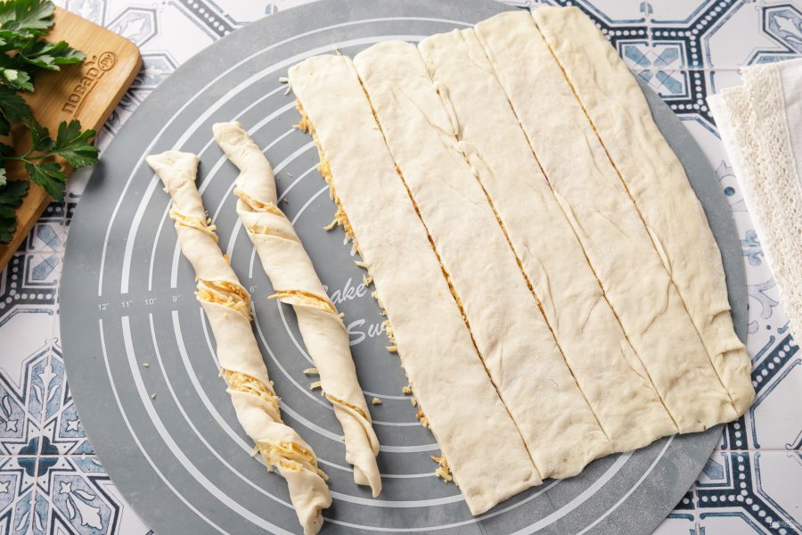 Нарежьте тесто на равные полоски любой желаемой ширины. Удерживая один край полоски, скрутите в спиральку второй край и в конце немного защипните край, чтобы он не раскрутился.