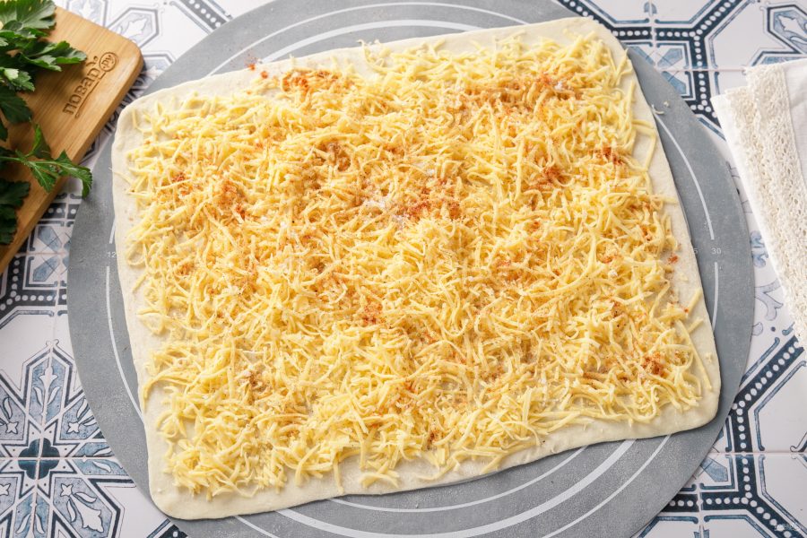Один пласт теста посыпьте тёртым на мелкой тёрке сыром. Можно использовать одновременно несколько сортов сыра.