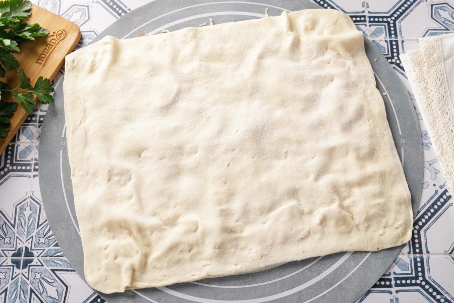 Пласт теста разделите на две части. Тонко раскатайте на посыпанной мукой поверхности. Смажьте поверхность каждого пласта взбитым яйцом при помощи силиконовой кисточки.