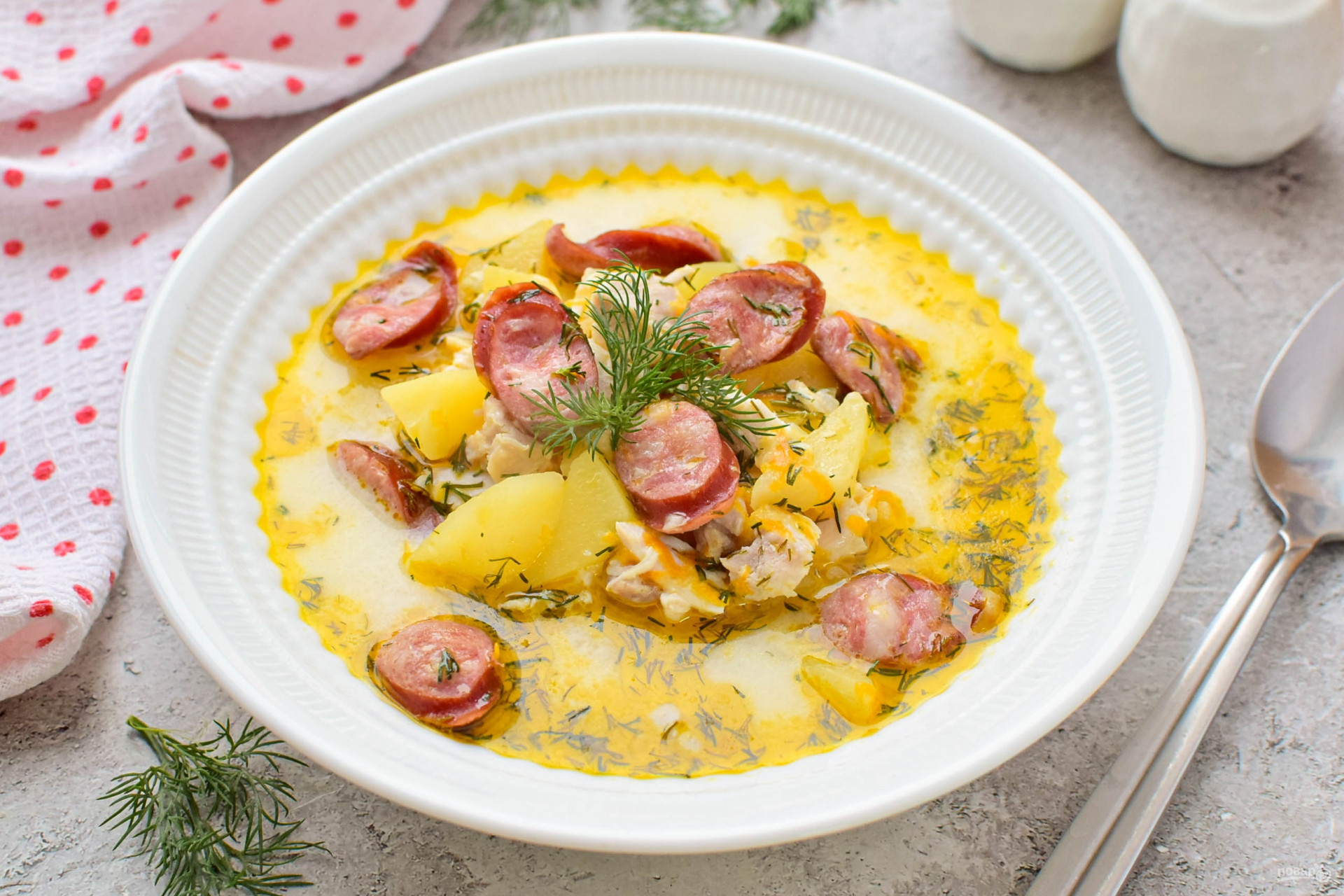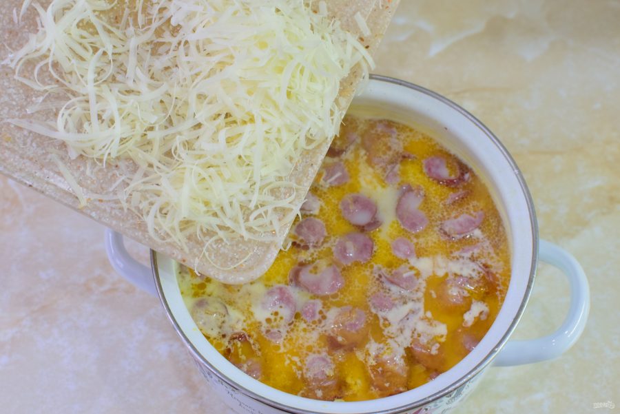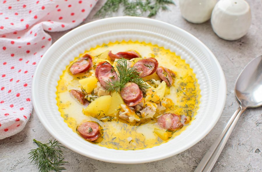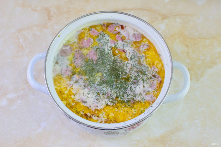 Следом добавьте плавленый сыр. Перемешайте, чтобы он полностью растворился в горячем супе.