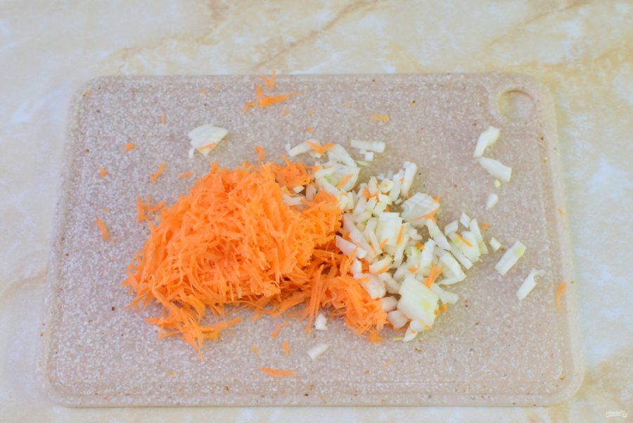 Очистите лук и морковь. Ополосните. Потрите морковь на терке, а лук мелко нарежьте.