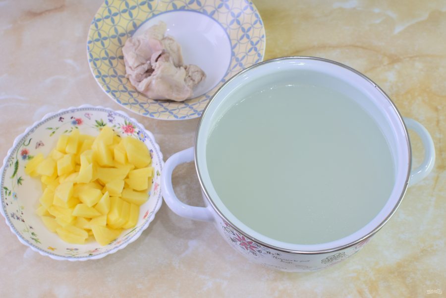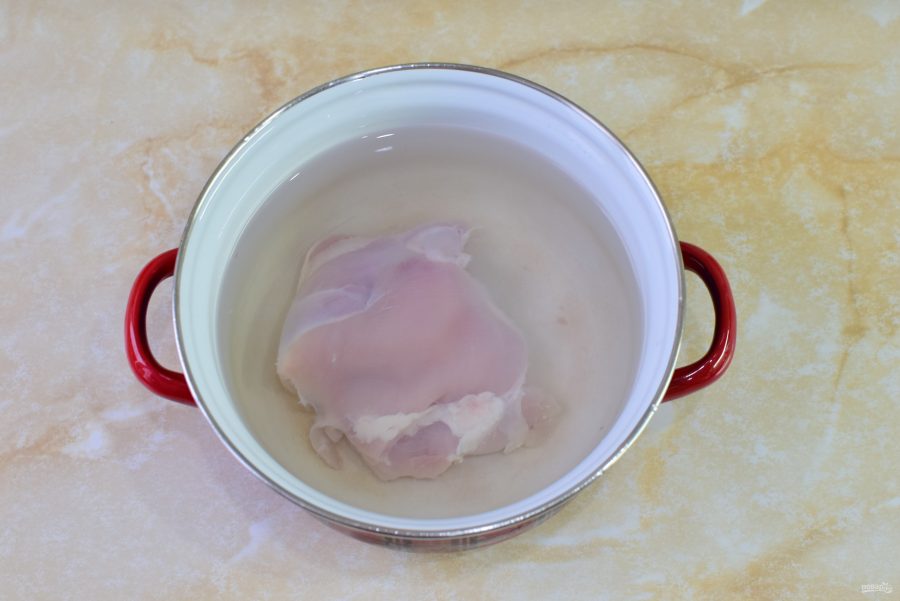 Куриное мясо залейте водой, поставьте на огонь и доведите до кипения. Проварите 20-30 минут.