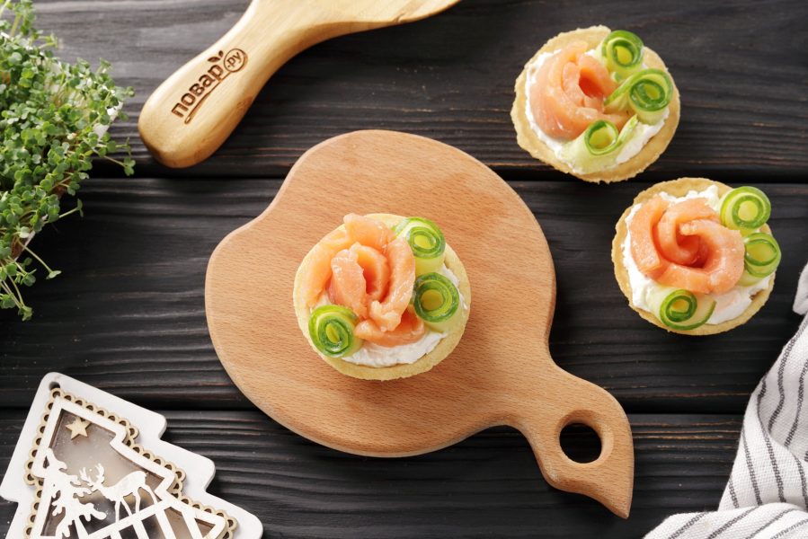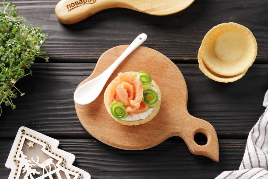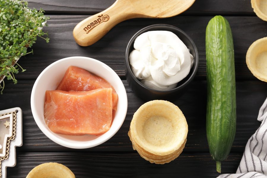 Подготовьте все ингредиенты по списку. Тарталетки выбирайте из рассыпчатого песочного теста. Творожный сыр без добавок. Использовать можете любую слабосолёную красную рыбу, у меня форель.