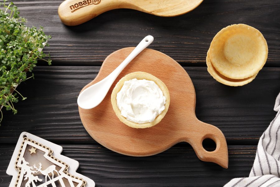 Тарталетки заполните творожным сыром. Можно просто при помощи ложки или с помощью кулинарного мешка.