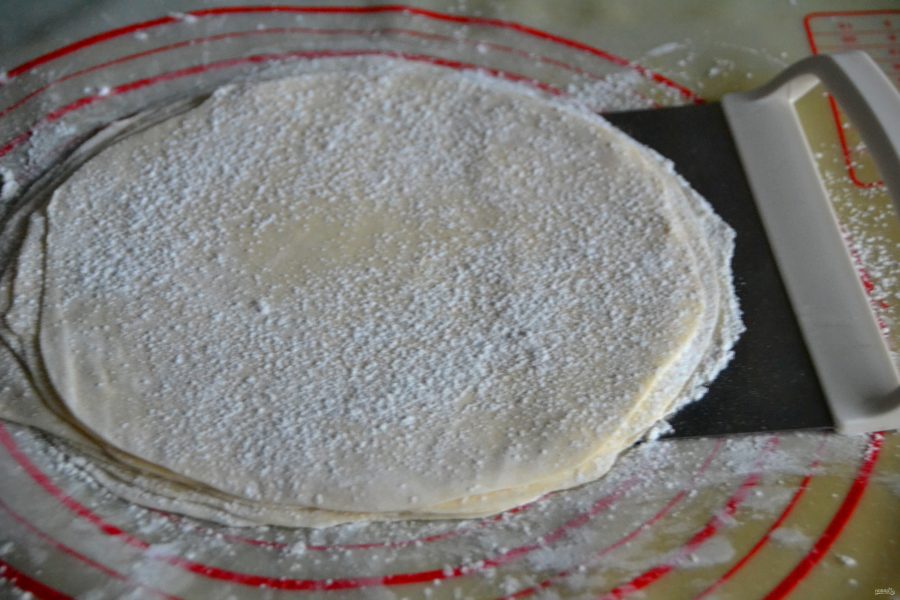 Раскатайте всю стопку теста легким нажатием скалки, без усилий, чтобы не склеить пласты теста. В процессе раскатки поворачивайте тесто по оси не руками, а с помощью резака или лопатки. Раскатайте тесто на этом этапе до диаметра примерно 25 см.