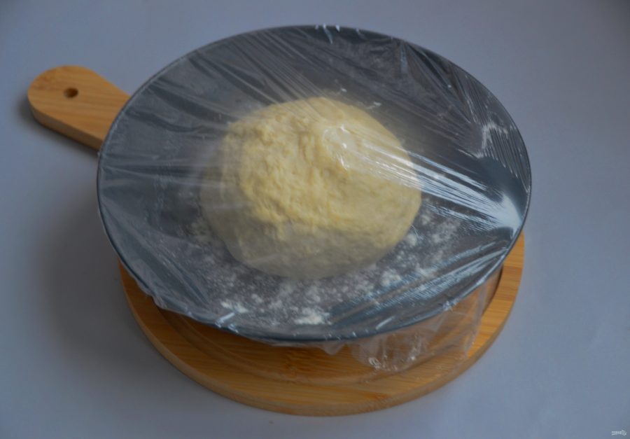 Подкатайте тесто в шар, выложите в миску, присыпанную мукой, накройте пищевой пленкой, оставьте на 30 минут.