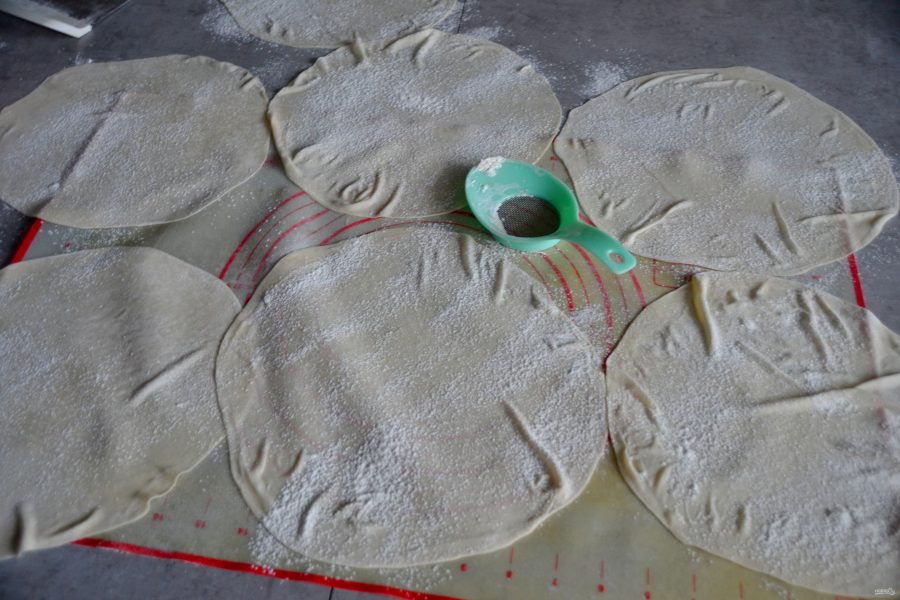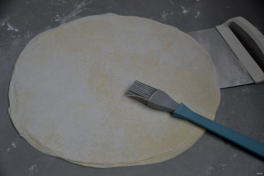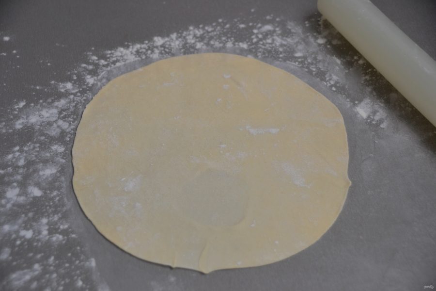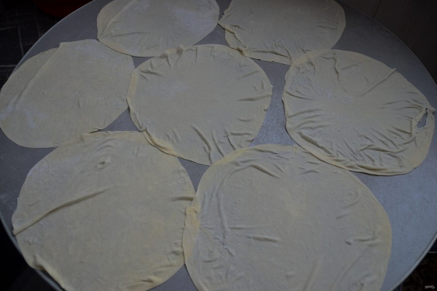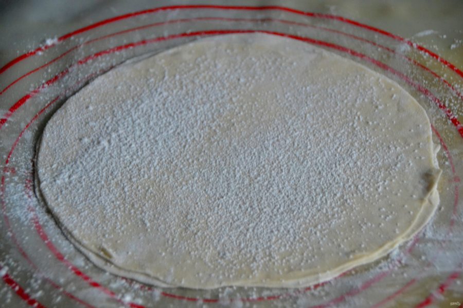 Раскатайте пласт теста диаметром примерно 20 см. Раскатка будет в три этапа, это первый этап раскатки.