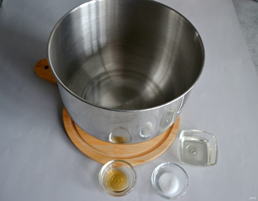 Всыпьте муку, замесите тесто. Тесто можно замесить руками примерно 7-10 минут, или с помощью тестомеса в течение трех минут.