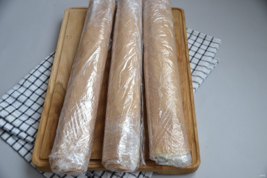 Если тесто приготовлено впрок, его необходимо завернуть в силиконовую бумагу, а затем обернуть пищевой пленкой.