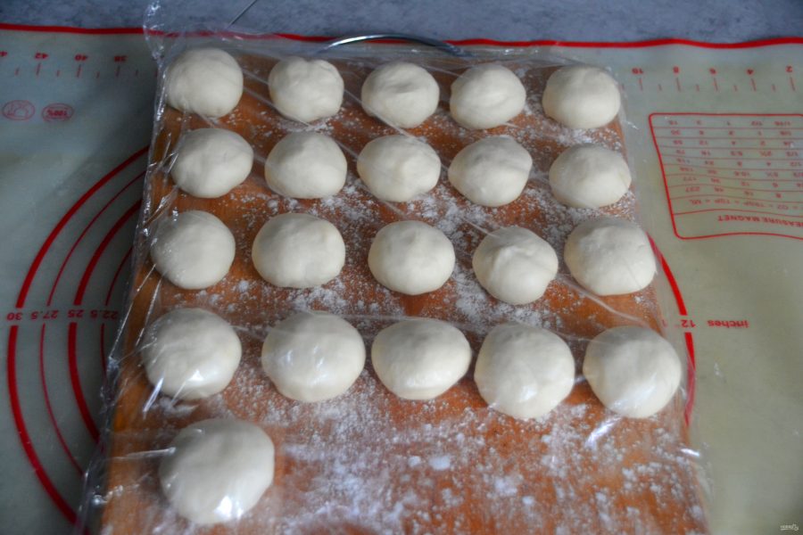 Разделите тесто на 21 часть весом примерно 21-22 грамма, старайтесь, чтобы части были ровными. Подкатайте каждый кусочек в шар, накройте пищевой пленкой.