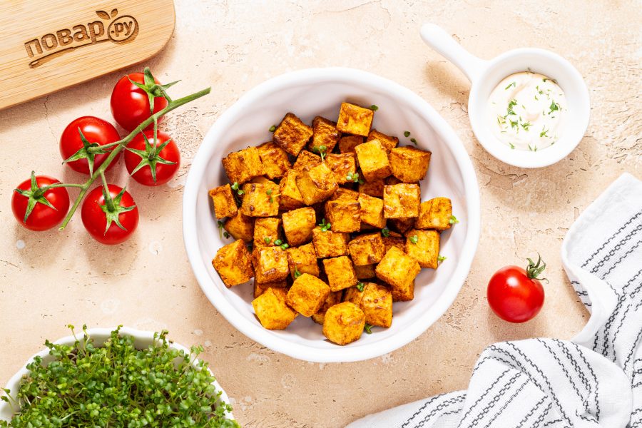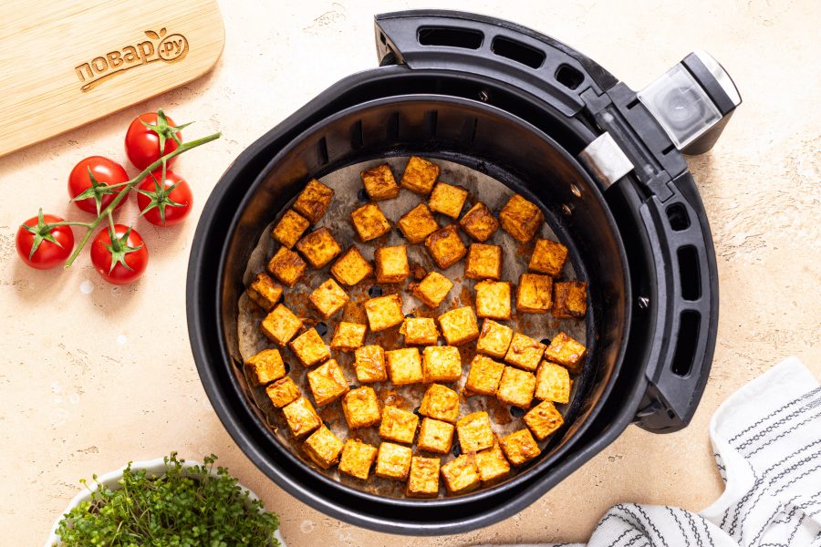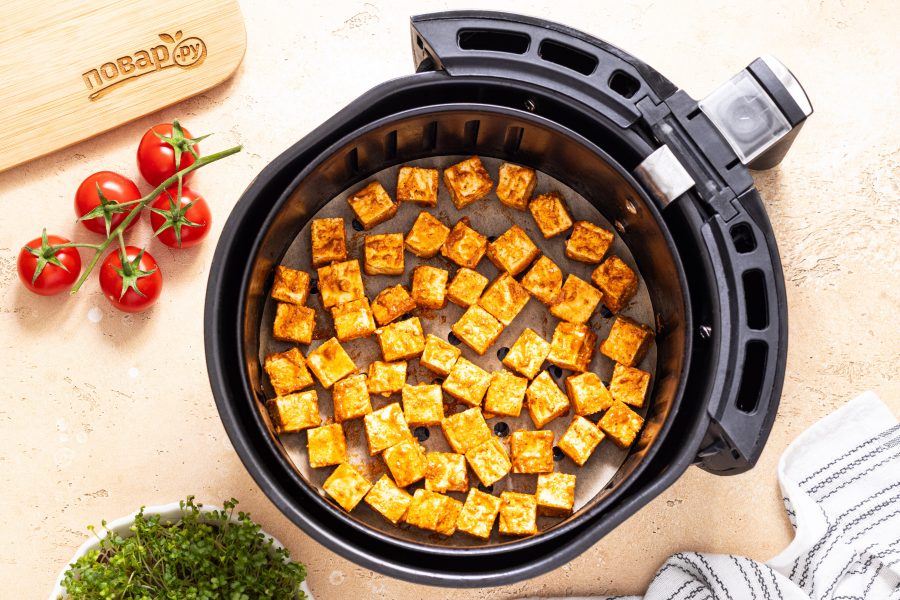 В аэрогриле легко и просто можете приготовить вкусный тофу. Получаются такие кубики с румяной корочкой в специях, хрустящие снаружи и мягкие внутри.