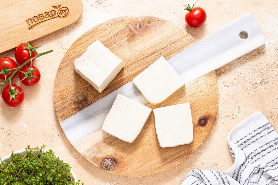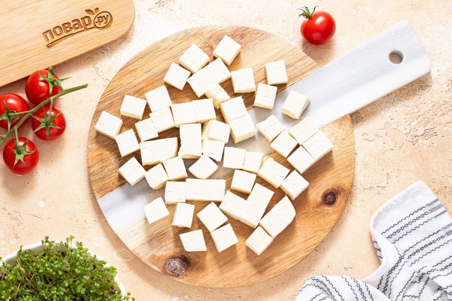 Когда пройдет половина времени, аккуратно перемешайте тофу, чтобы он зажарился со всех сторон равномерно.