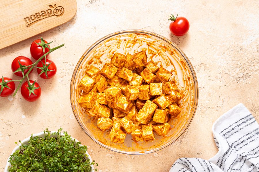 Все перемешайте, чтобы соус равномерно распределился по каждому кубику. Я обычно накрываю миску крышкой и хорошо встряхиваю.