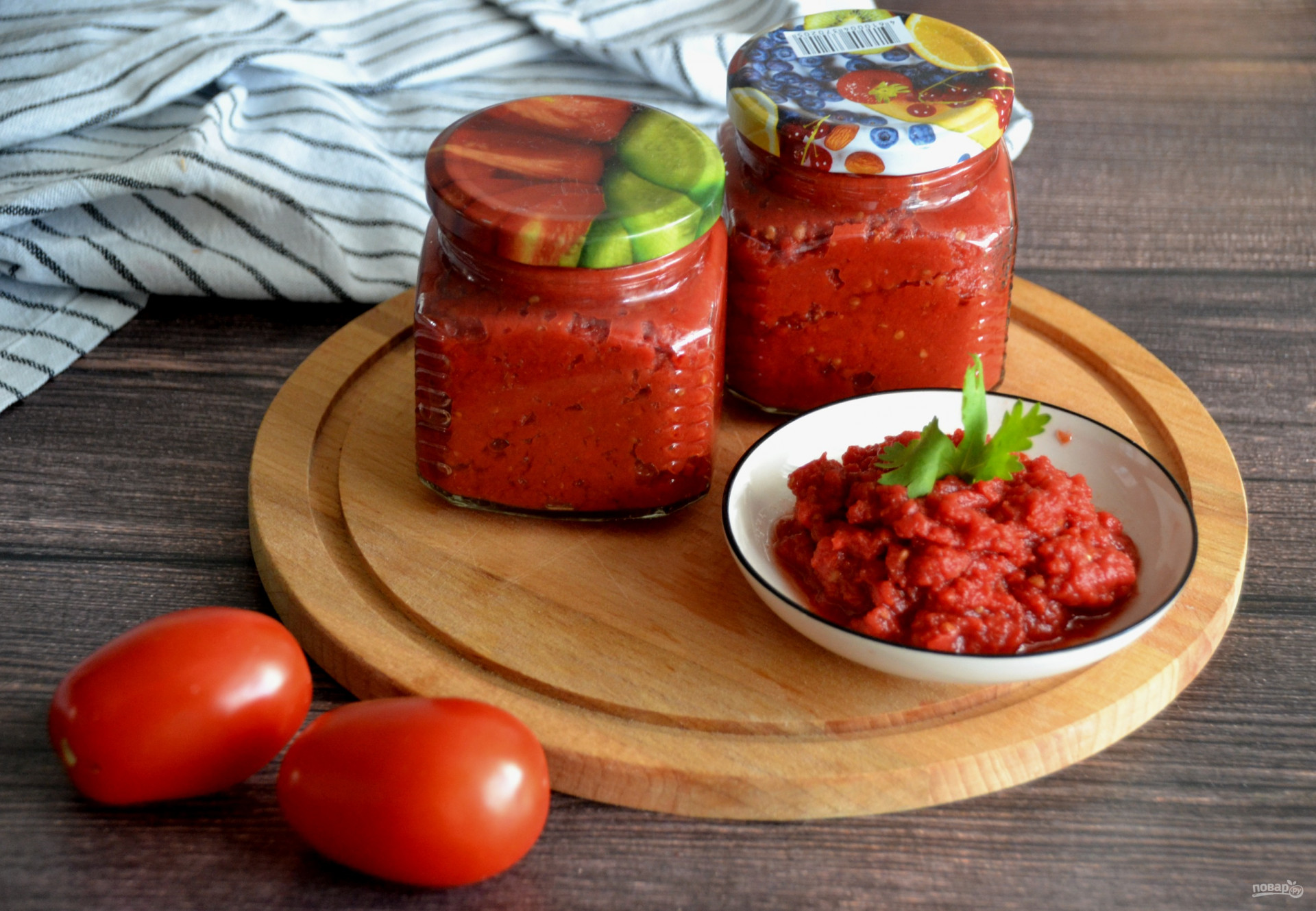 Готовую томатную пасту разложите по баночкам. Такую пасту можно заморозить порционно, а можно законсервировать обычным способом. Банки с томатной пастой установите в кастрюлю, дно которой застелено салфеткой, залейте горячей водой и стерилизуйте около 25-30 минут. После чего закройте крышками, переверните вверх дном и накройте чем-то теплым, например, пледом до полного остывания.