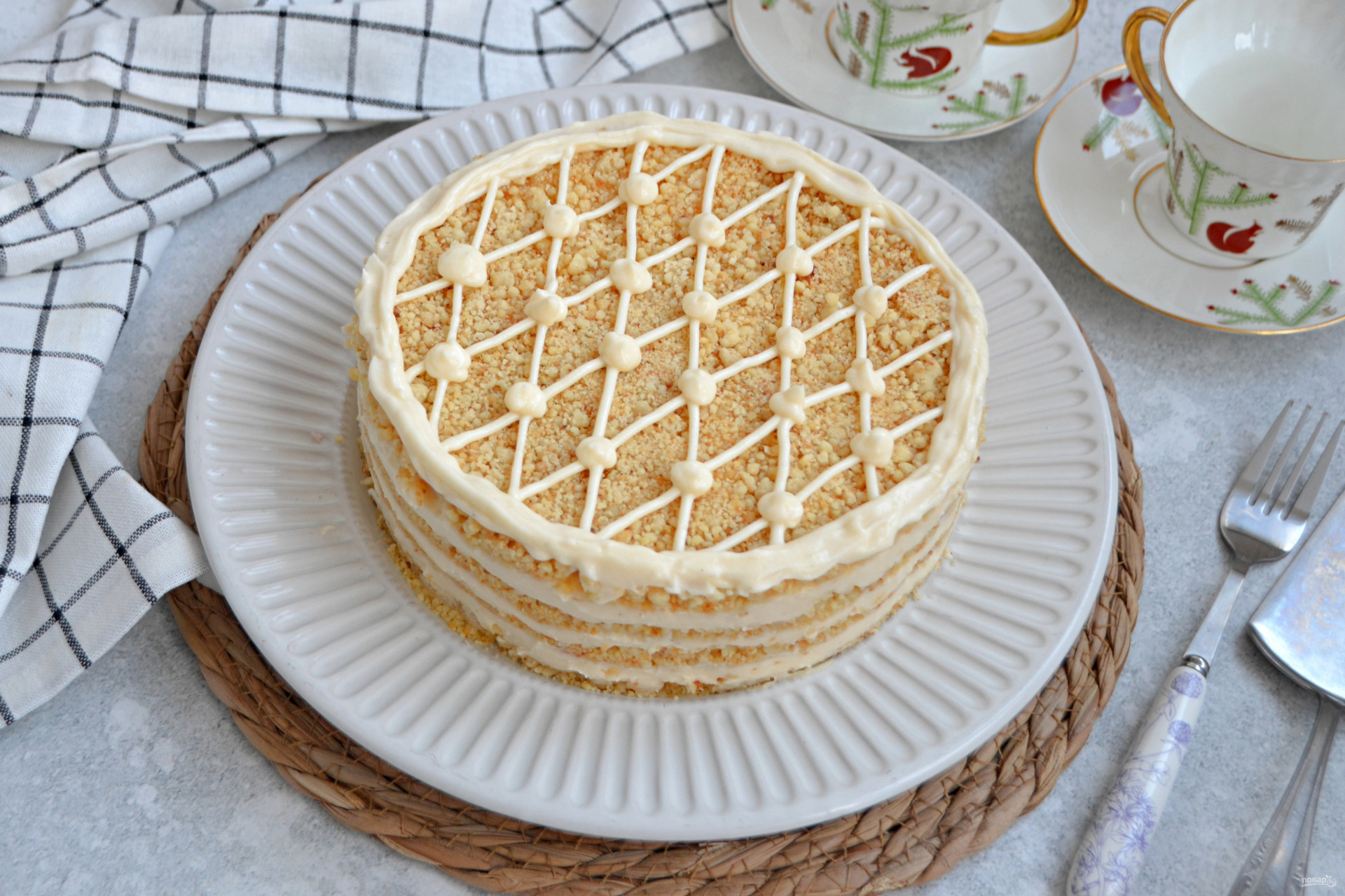 Переложите оставшийся крем в кондитерский мешок, можно без всякой насадки, только срезать кончик мешка, украсьте торт простым декором — нанесите сеточку из крема. В сезон можно украсить свежими ягодами.