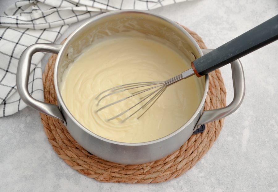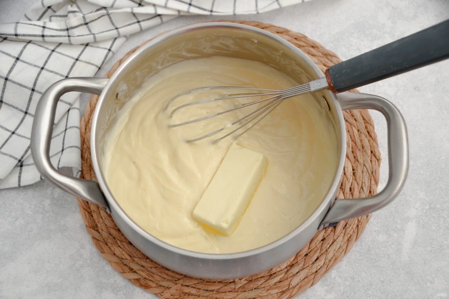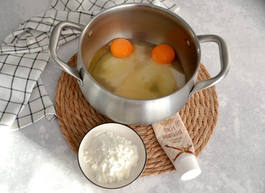 Для приготовления крема вбейте в кастрюлю или в сотейник 2 яйца, добавьте 150 грамм сахара и 2 ст. ложки крахмала. Добавьте ванильную пасту или ванильный сахар.