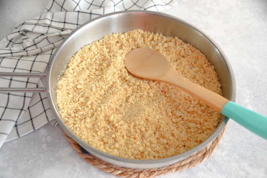 Всыпьте мучную смесь на сковороду и на небольшом огне обжаривайте при постоянном перемешивании. Используйте деревянную лопатку.