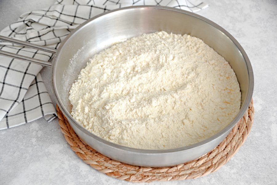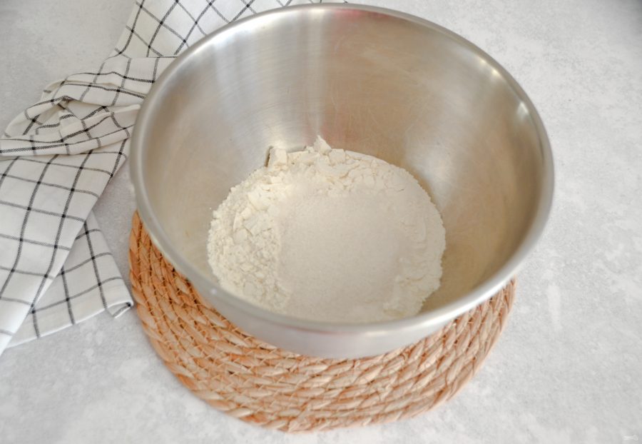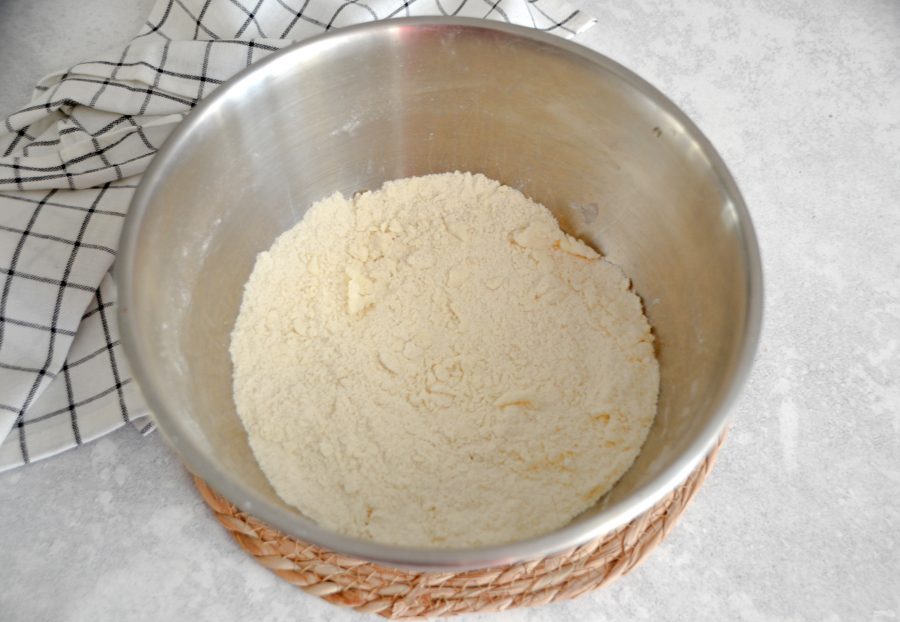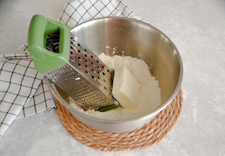 Натрите на терке 150 грамм холодного сливочного масла в миску с мукой. Чтобы масло хорошо натиралось, время от времени опускайте его в муку.