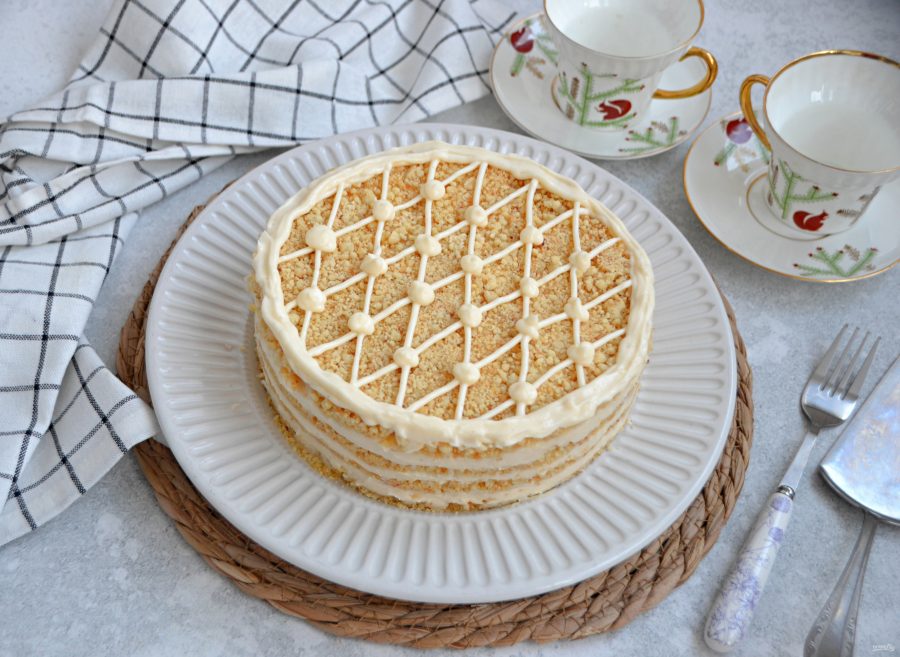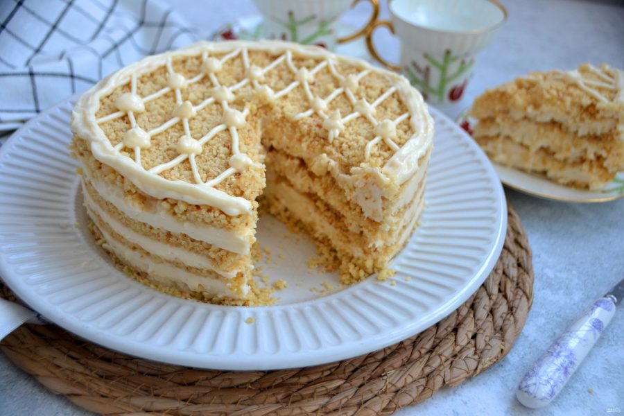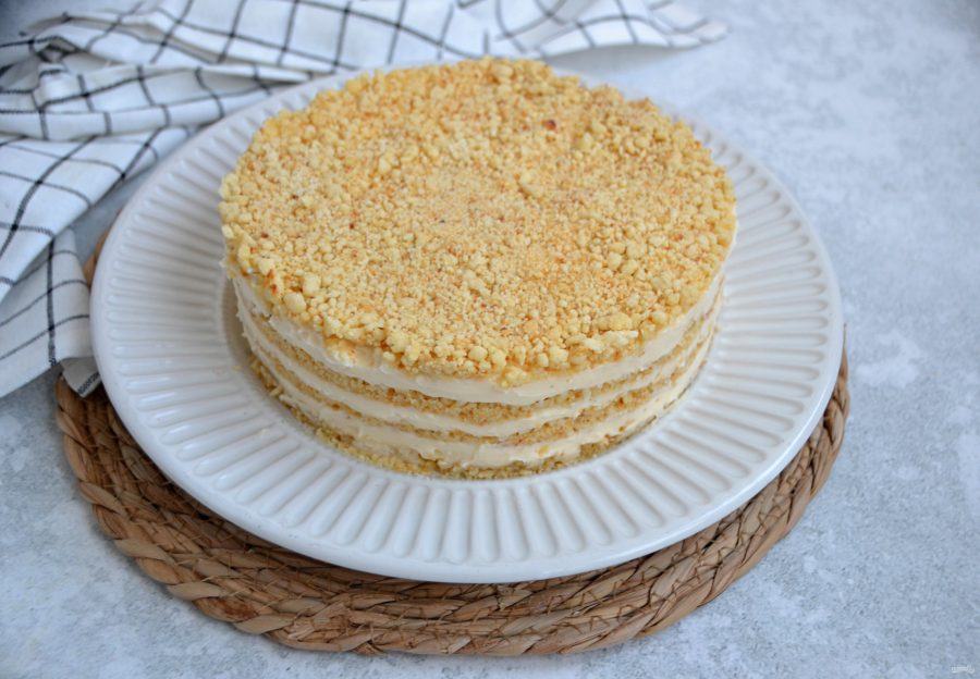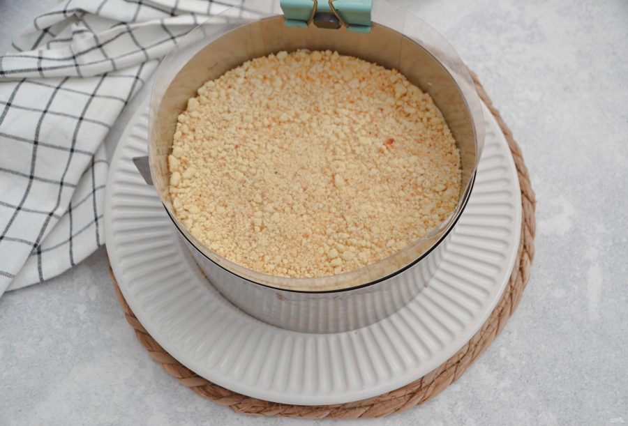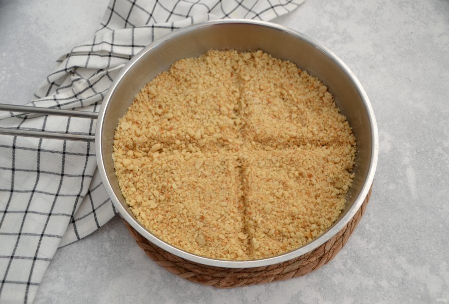 Точно так же выложите все 4 слоя, верхний слой из песочной крошки. Оставьте примерно 2 ст.ложки крема для финального декора. Поставьте торт в холодильник не менее, чем на 4-5 часов для стабилизации, для того, чтобы крем пропитал песочную крошку.