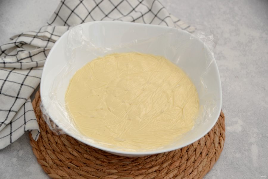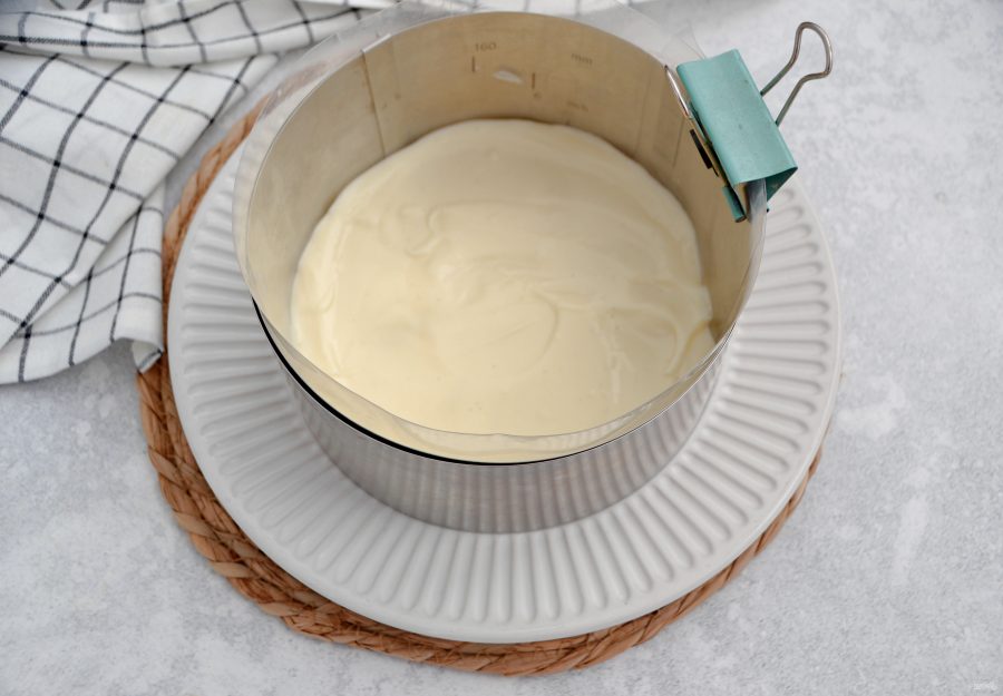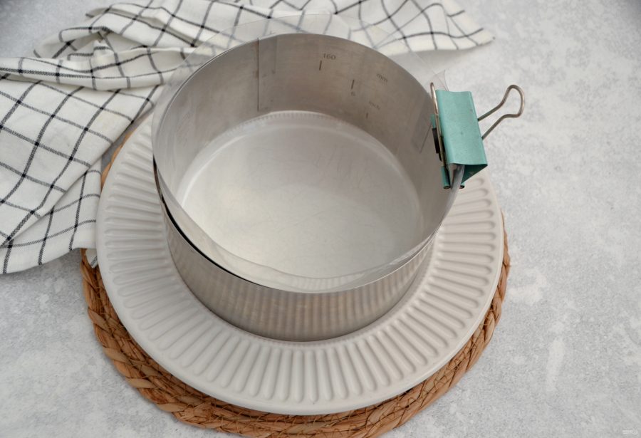 Установите кулинарное кольцо диаметром 16-18 см. на тарелку. Бока проложите ацетатной пленкой или просто оберните кольцо пищевой пленкой.