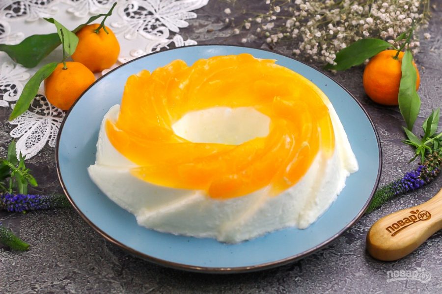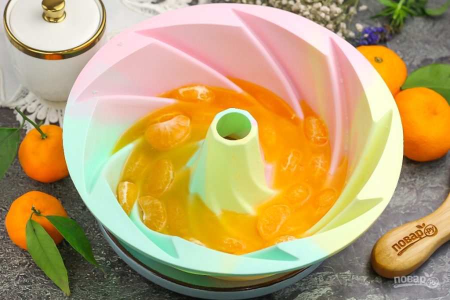 Перемешайте с мандариновым соком и залейте им дольки фруктов в емкости. Поместите на холод минимум на полчаса. Спустя указанное время проверьте плотность желе, если оно застыло — готовьте следующее.