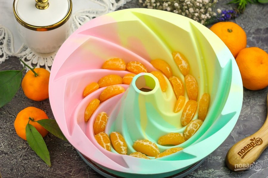 Очистите 3-4 мандарина от кожуры и удалите белые волокна, разделите плоды на дольки. Обязательно удалите косточки в дольках.