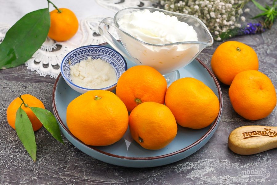Для приготовления десерта можно использовать только мандариновый сок или заменить сметану взбитыми сливками. Обязательно дожидайтесь полного застывания мандаринового слоя, прежде чем заливать сметанный, чтобы они не перемешались. Украшайте десерт по своему вкусу и подавайте его с горячими напитками.Состав / Ингредиенты: