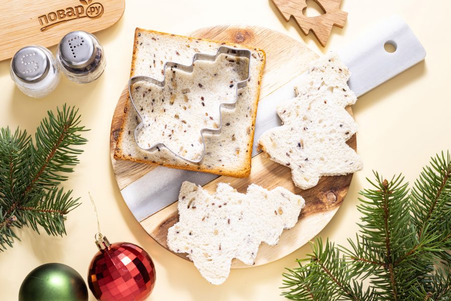 С помощью формы для печенья вырежьте из ломтиков хлеба елочки.