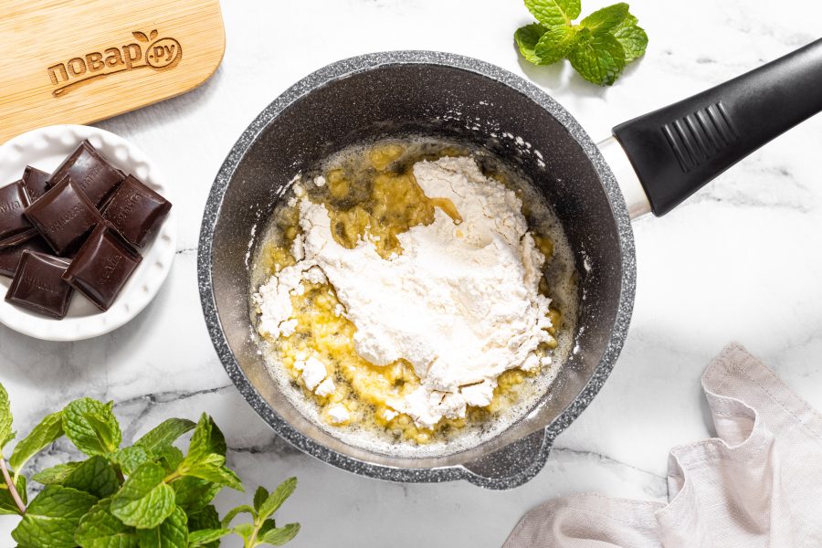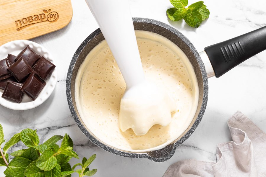 Доведите до кипения. На среднем огне проварите до появление первых пузырьков, помешивая смесь венчиком.