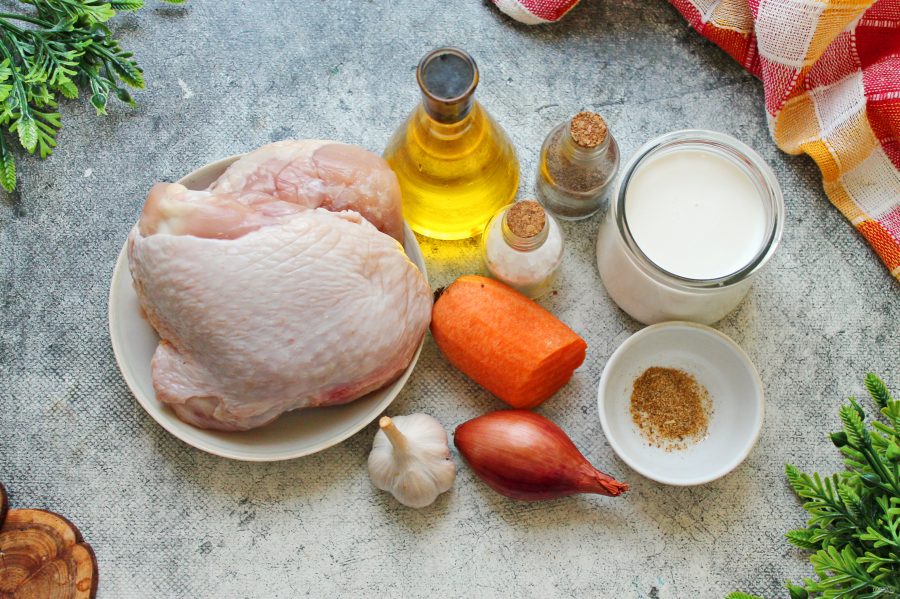 Подготовьте все необходимые ингредиенты для приготовления тушеных куриных бедер. Овощи почистите и сполосните. Куриные бедра сполосните и обсушите бумажным полотенцем.