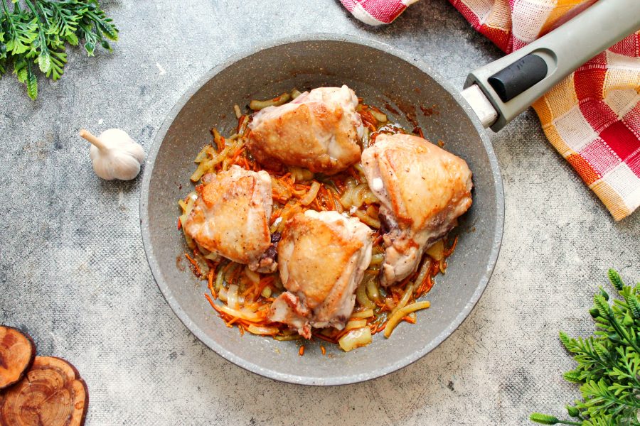 Закройте сковороду крышкой, установите медленный огонь и тушите бедра в течение 25-30 минут до готовности.
