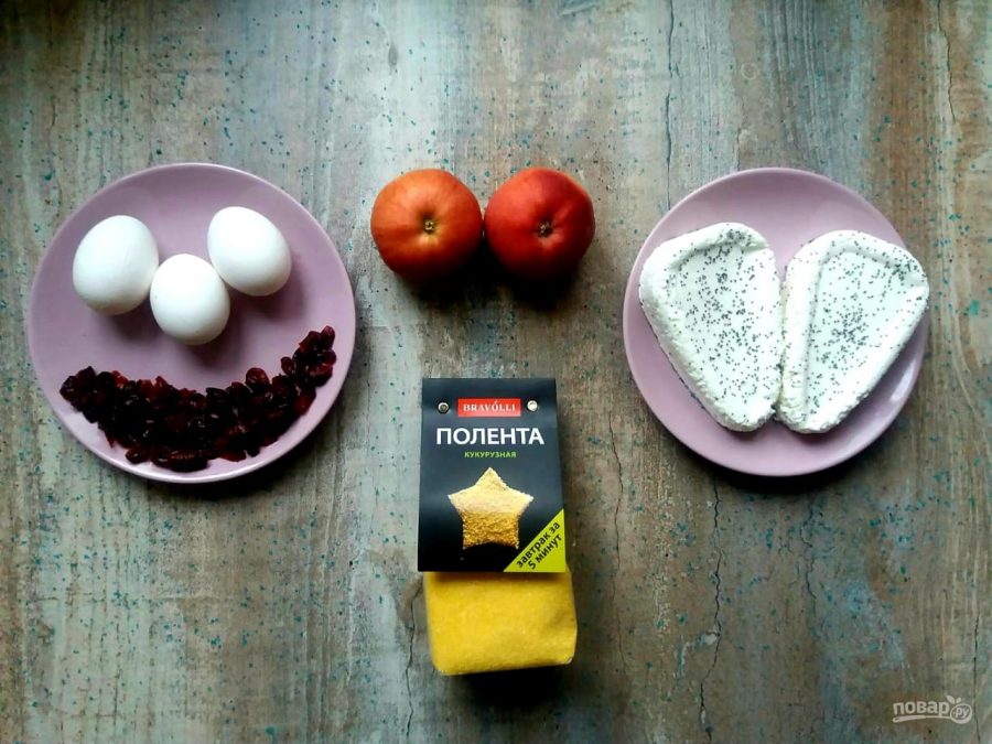 Подготовьте творог, яйца, поленту, сухофрукты, яблоки.