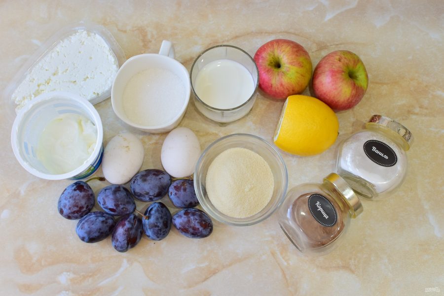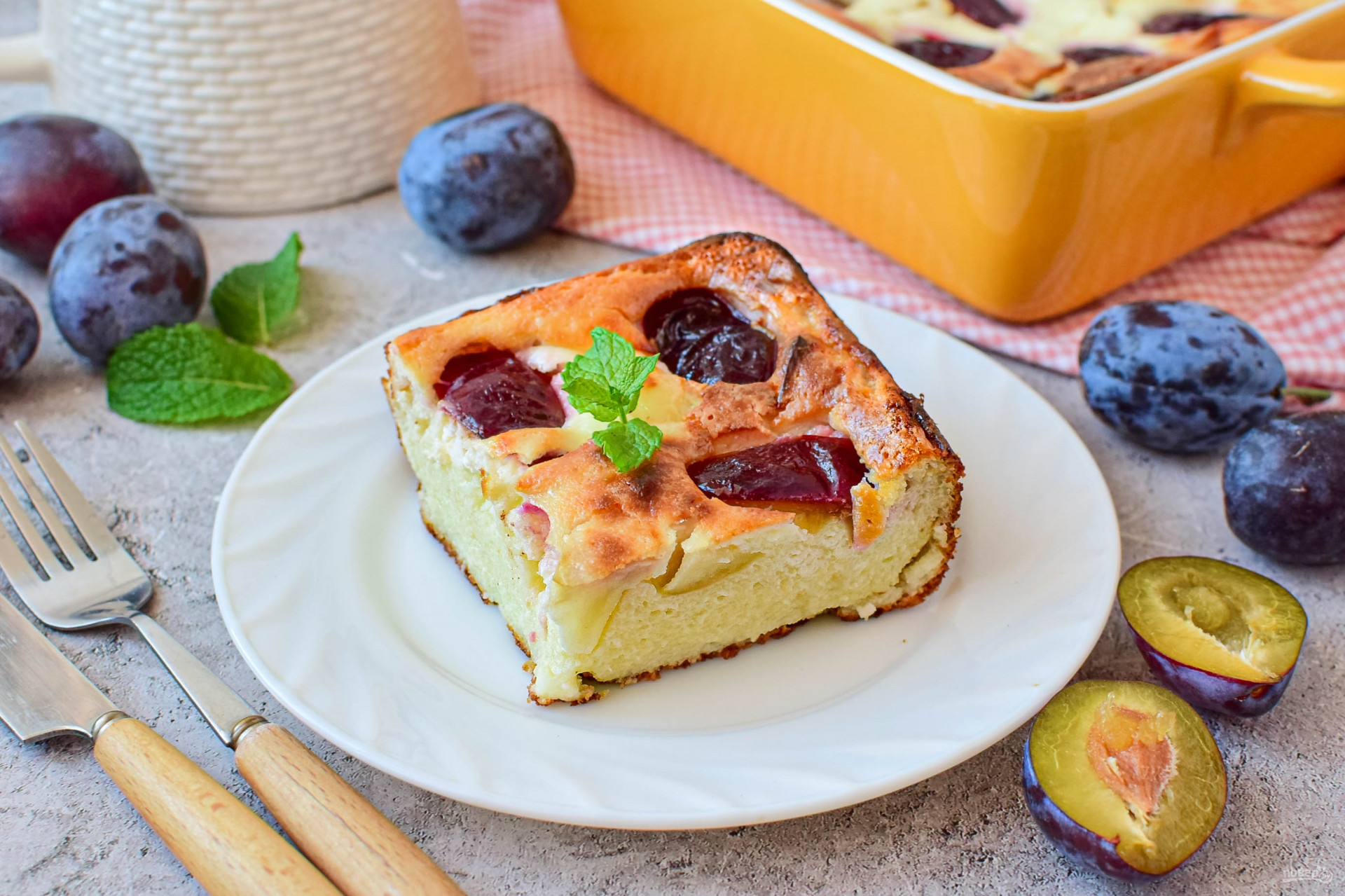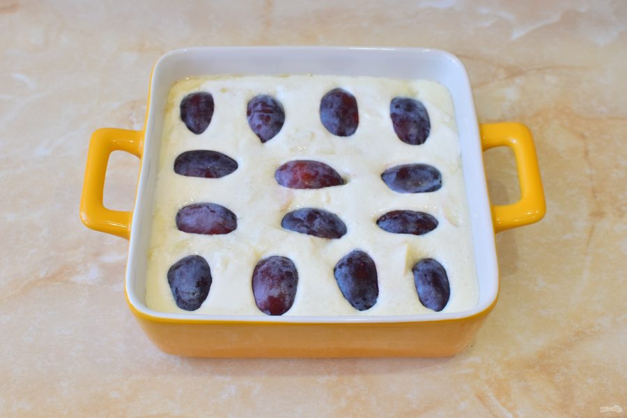 Разложите нарезанные сливы. Поставьте запеканку в духовку, предварительно разогретую до 180 градусов, примерно, на 40 минут. Ориентируйтесь по своей духовке.