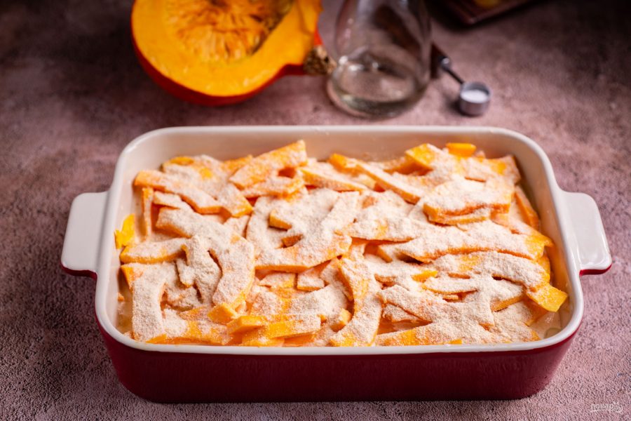 Достаньте форму с запеченной тыквой из духовки и при желании чуть присыпьте мелко