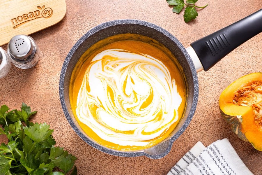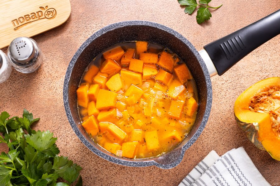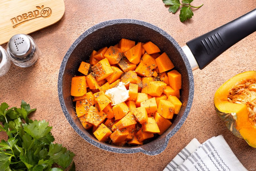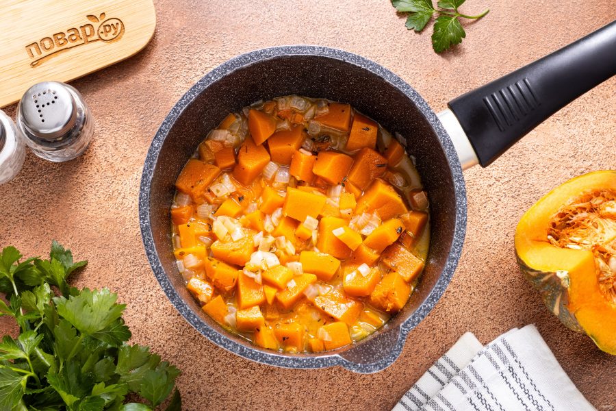 Накройте крышкой и тушите на слабом огне около 15-20 минут до мягкости тыквы.