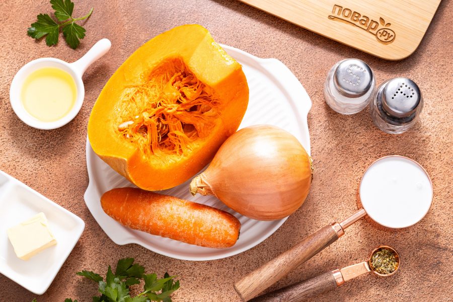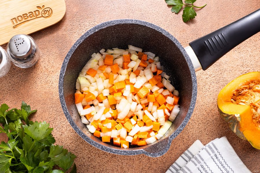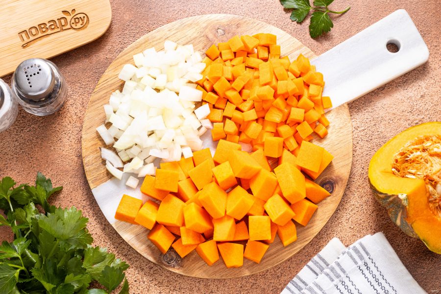 Тыкву очистите от кожуры, удалите семечки с мякотью. Нарежьте кубиками или ломтиками среднего размера. Морковь очистите от кожуры. Нарежьте репчатый лук с морковью на кубики небольшого размера.