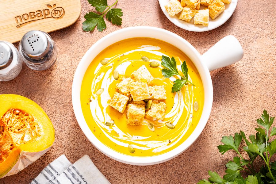 Подавать суп можно с гренками и обжаренными тыквенными семечками. Тыквенный крем-суп готов, приятного вам аппетита!