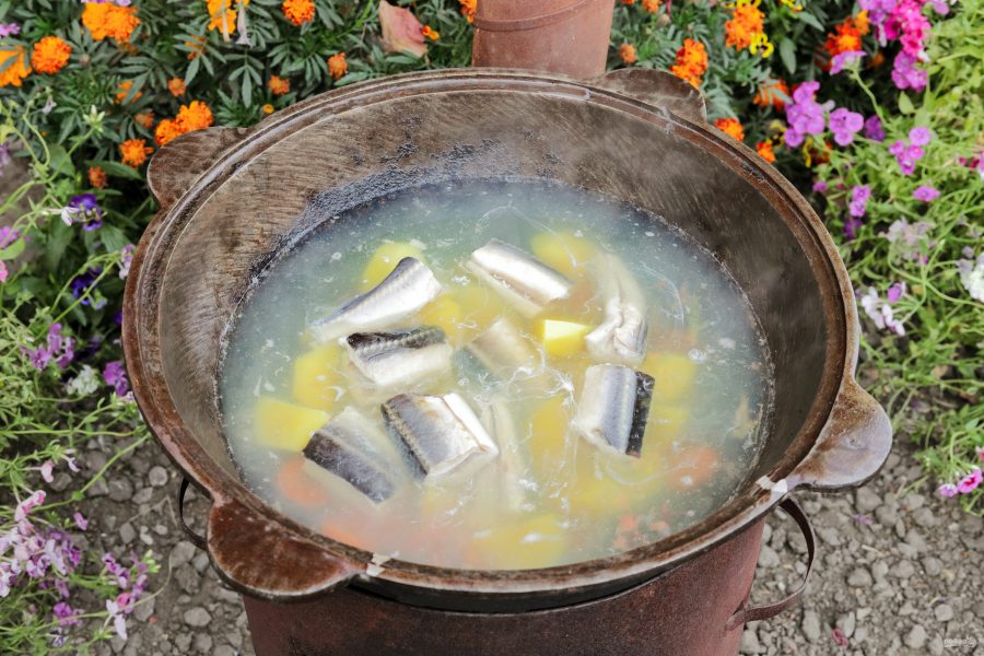 Уха — идеальное блюдо для похода или пикника. Для неё можно использовать многочисленные виды рыб и даже раков. Сегодня расскажу, как приготовить уху из стерляди на костре для обеда на свежем воздухе. Количество указанных ингредиентов подойдёт для большой компании. Чтобы бульон получился прозрачным, но наваристым, добавляйте рыбу в холодную воду, а затем периодически убирайте пенку, которая появляется в процессе варки. Вода не должна сильно кипеть, если хотите получить максимально вкусную уху. Следите за тем, чтобы огонь под казаном был умеренным, и не накрывайте его крышкой. Из специй можно добавить перец горошком, петрушку, укроп, шафран, розмарин, мускатный орех и имбирь. Главное — не переборщите, чтобы специи не перебили аромат рыбы.Состав / Ингредиенты: