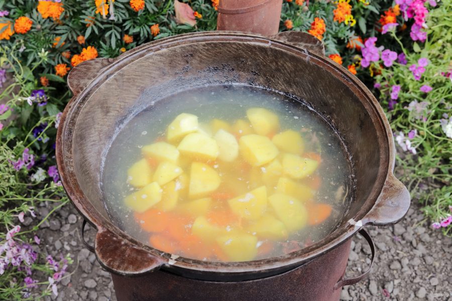 Уха из стерляди на костре готова. Накройте казан крышкой, снимите с огня и подождите 7-10 минут, чтобы блюдо настоялось.