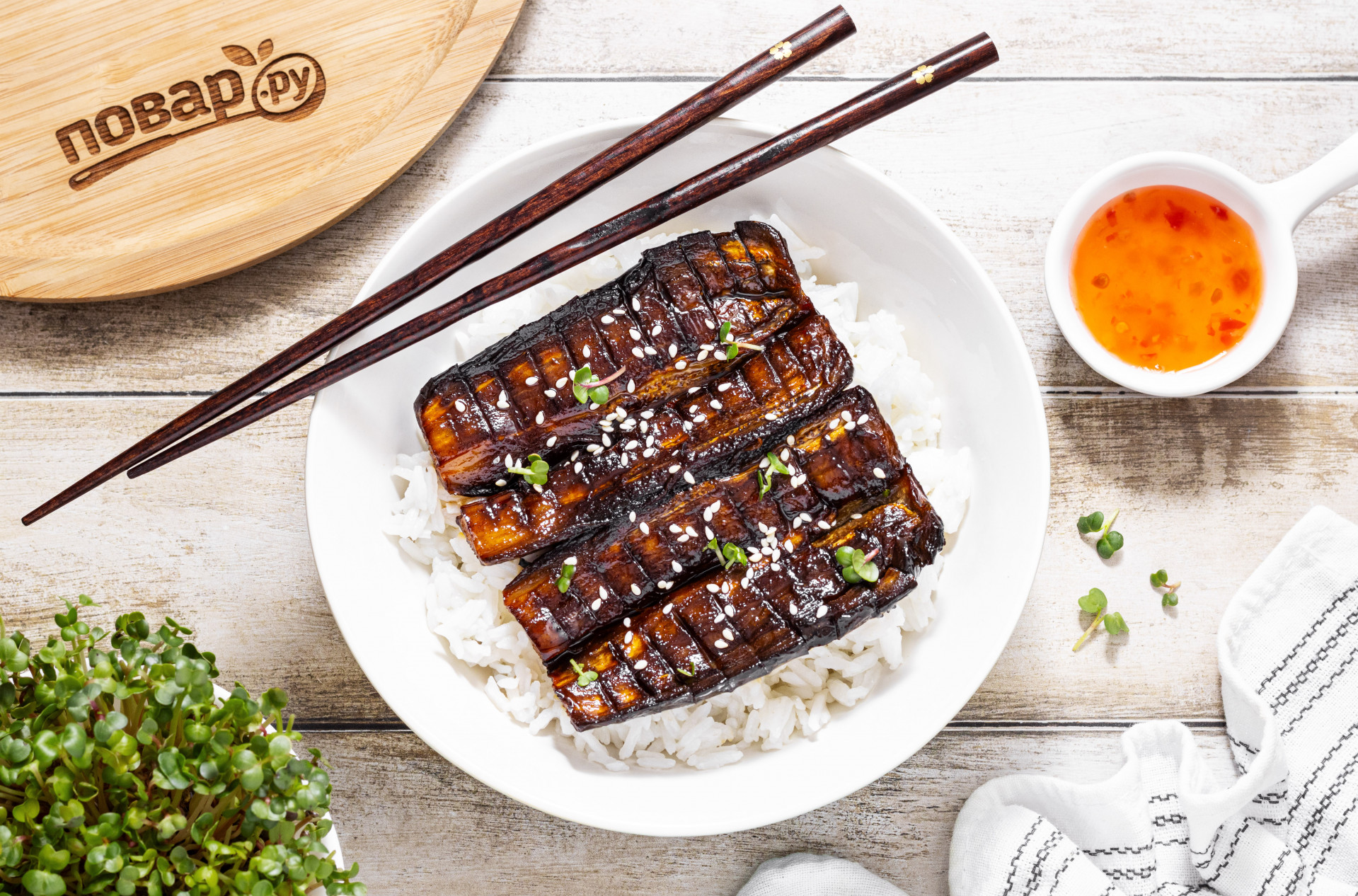 Для тех, кому нравится азиатская кухня, рекомендую попробовать унаги из баклажана. Вообще унаги — это не только название для японского соуса, но и блюдо с угрем.