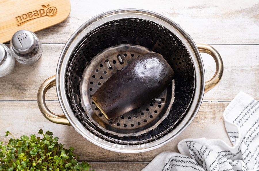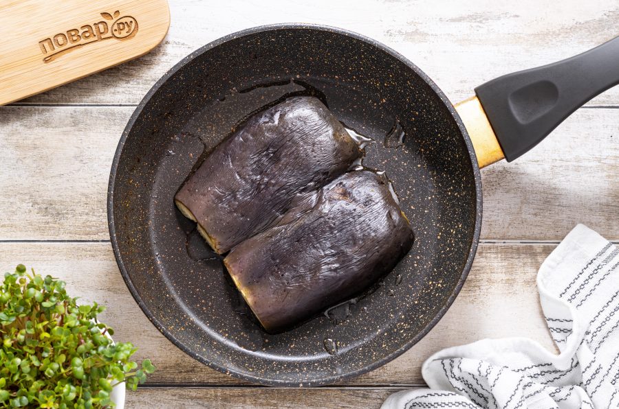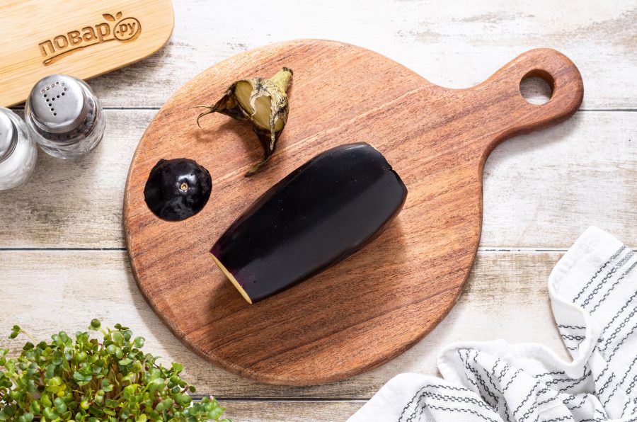 Остудите баклажан. Разрежьте почти пополам, но не доходя до конца. Затем на каждой половинке сделайте еще один разрез вдоль и несколько поперек.