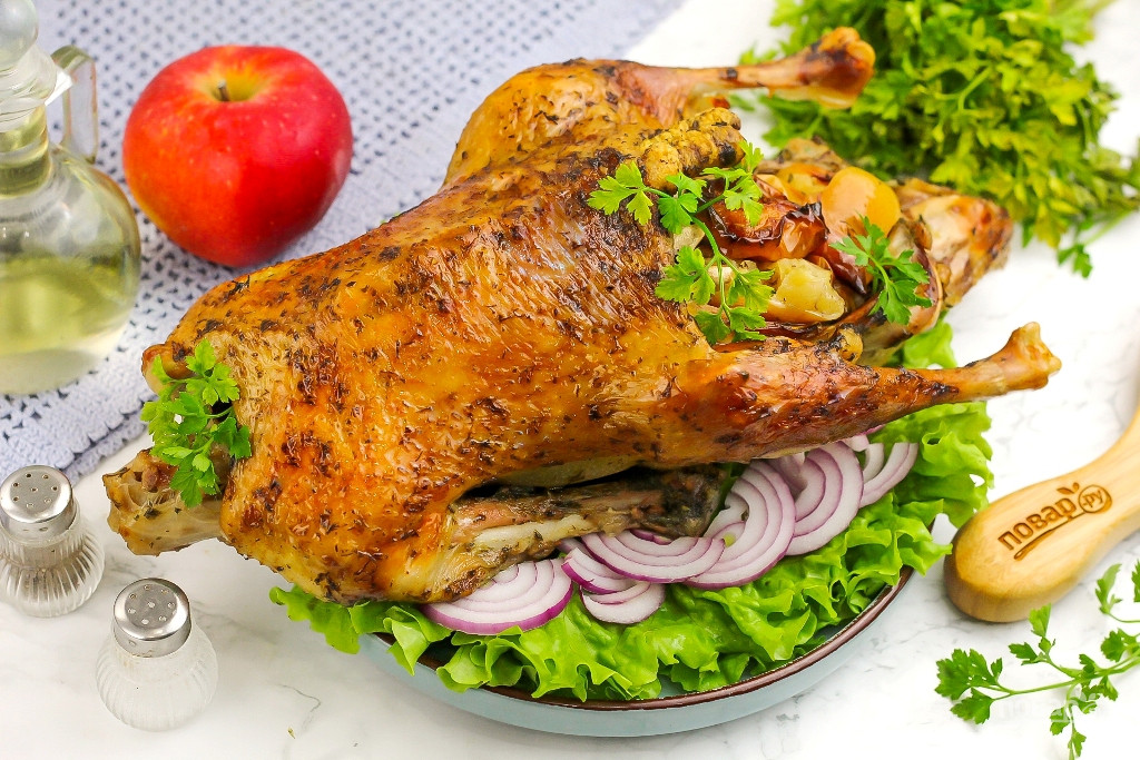 Начините утку внутри яблочной нарезкой, выкладывая как можно плотнее.