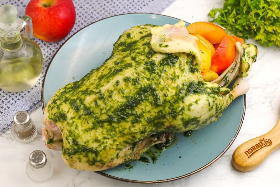 Перемешайте соус "Песто" с соевым соусом, солью и натрите маринадом утку внутри и снаружи, оставляя минимум на 2 часа при комнатной температуре. По желанию можно заменить соус "Песто" на чесночный, сметанный и т.д.