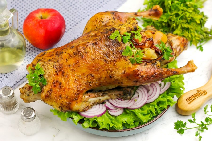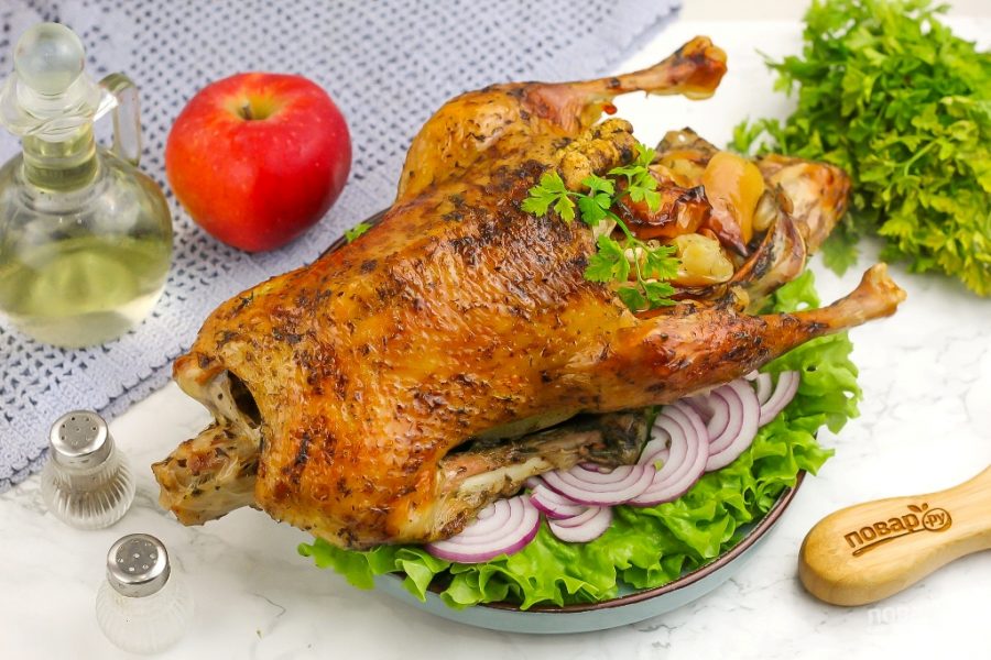 Подготовьте указанные продукты. Утку промойте внутри и снаружи, подсушите бумажными салфетками. Срежьте верхние фаланги крыльев — в них мяса нет, а подгорают они очень быстро.