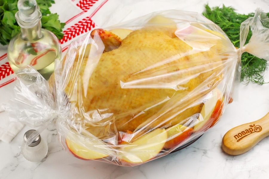 Поместите утку в рукав, добавьте туда ломтики яблок и завяжите рукав с обеих сторон как можно плотнее, чтобы воздух не выходил из него. Разогрейте духовку до 200 градусов. Поместите утку на противень на средний ярус, убавьте нагрев до 180 градусов и запеките птицу в течение 1,5 часов.