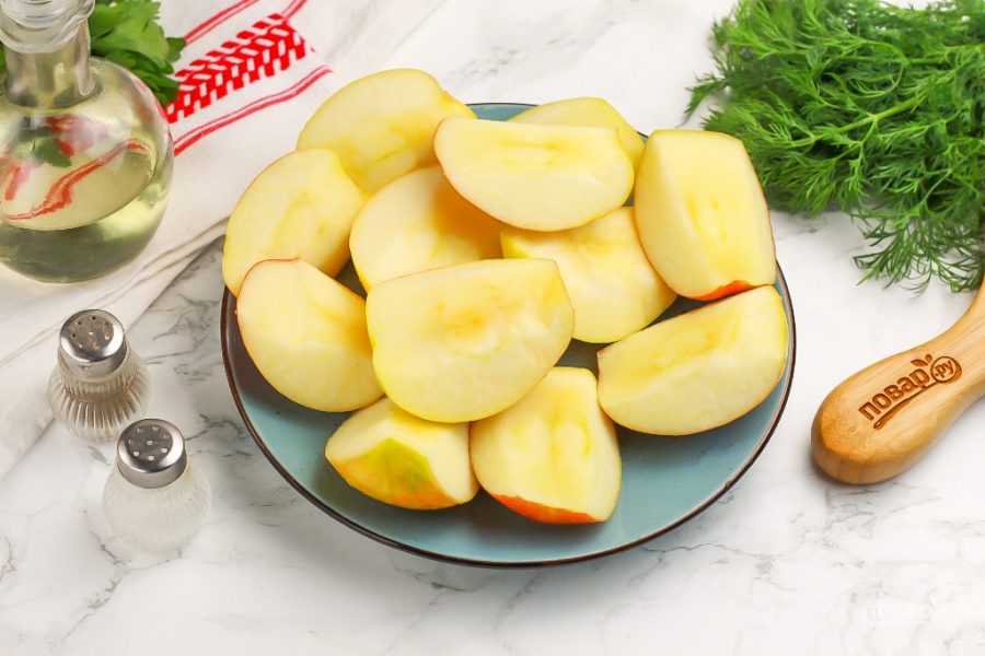 Промойте яблоки в воде, нарежьте на четвертинки и вырежьте семенные блоки. По желанию можете нарезать крупными кубиками или ломтиками.