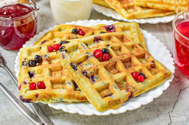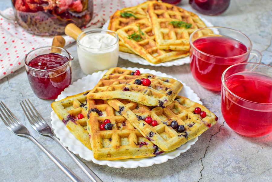 Ягоды в начинку можно взять замороженные — малину, чернику, бруснику, черную смородину. Вафли пекутся по 4-6 минут, каждая порция. Точного времени нет. Ориентируйтесь по своему прибору и по степени поджаренности.Состав / Ингредиенты: